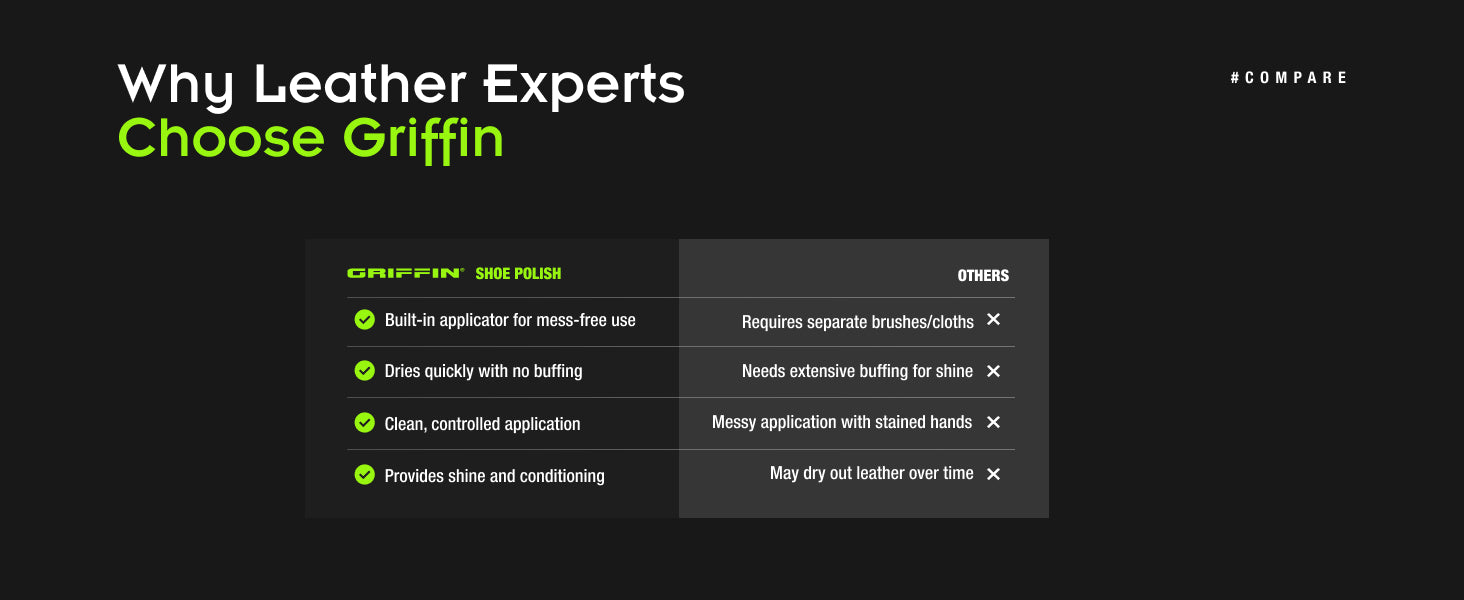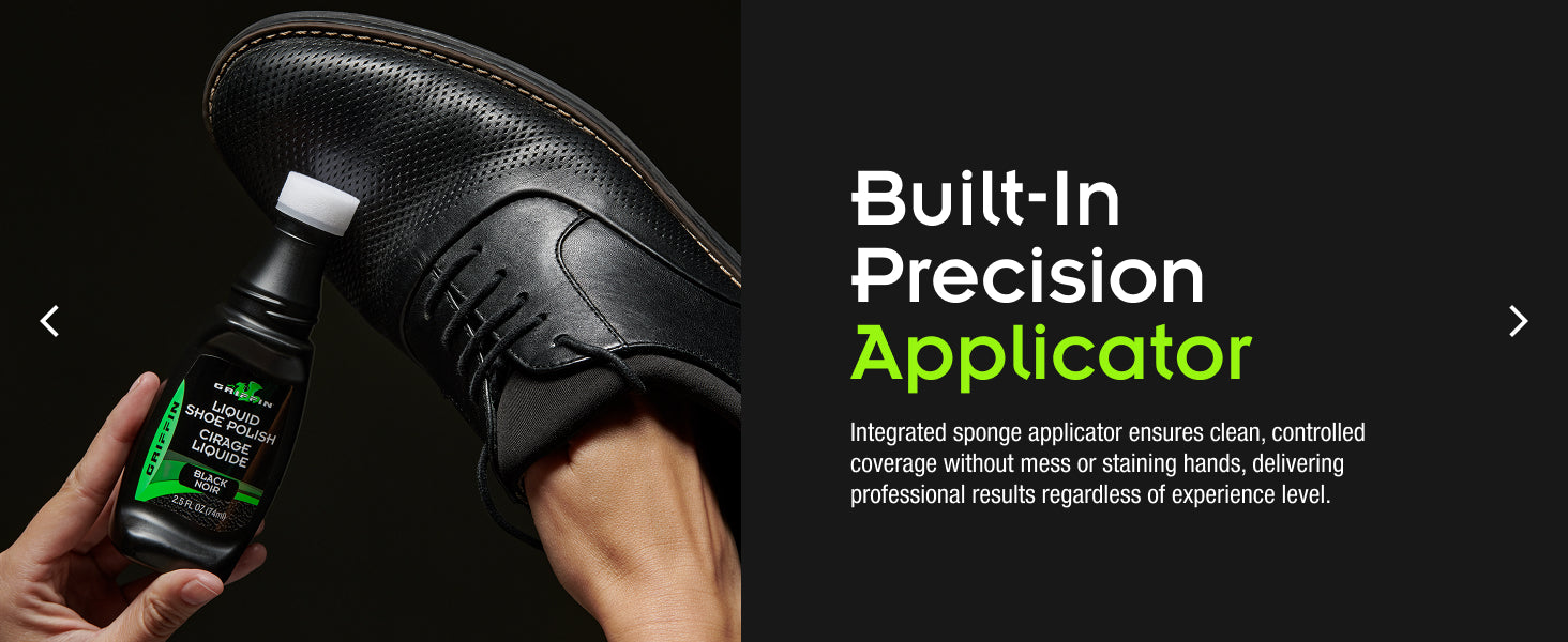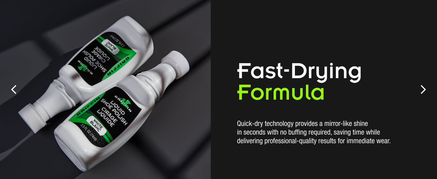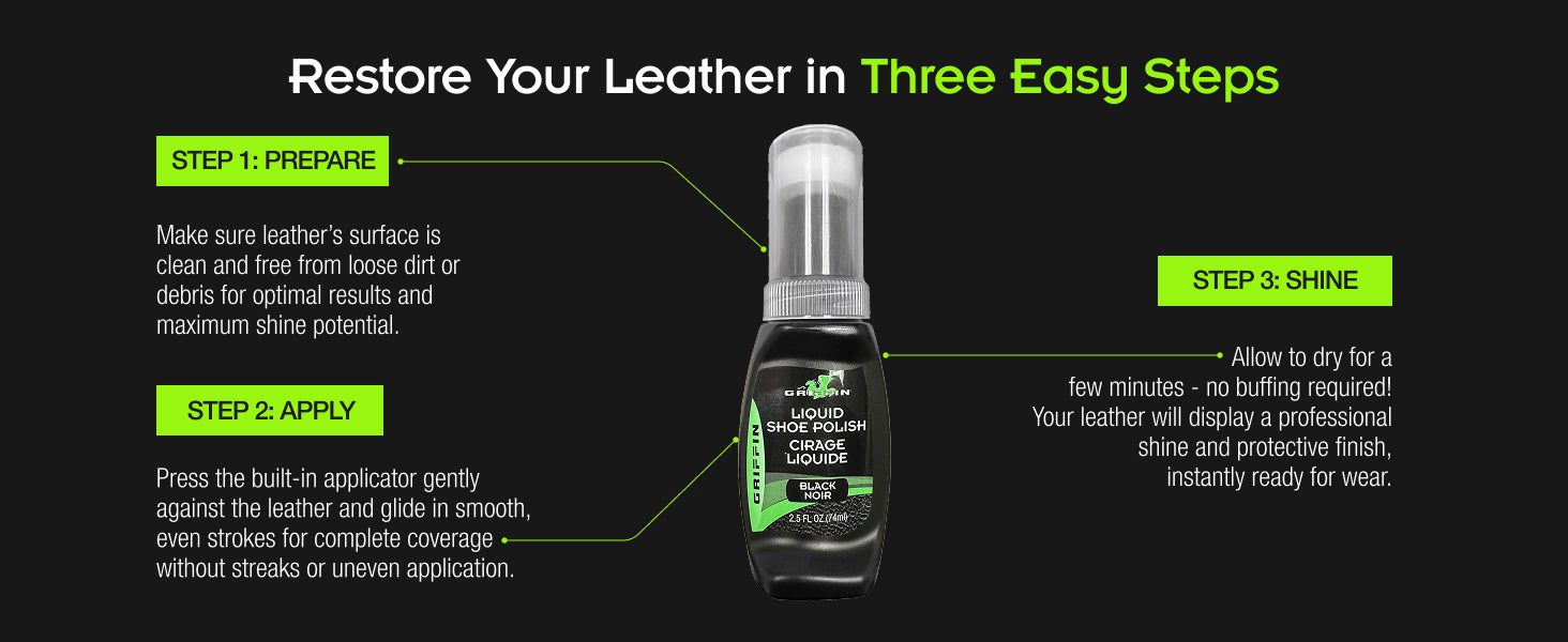 Griffin Shoe Care® Liquid Shoe Polish is shoe shine at your finger tips. Our formula is the perfectly crafted polish to achieve a great, fresh color. Always keep your shoes looking pristine. The attached sponge applicator also allows for quick and easy application.